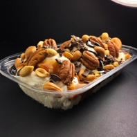 Three scoops of our pure Vanilla Custard, each scoop topped separately with Mint Hot Fudge, Amaretto Marshmallow, and Rum Caramel sauce. A finishing touch of Pecans, Cashews, Peanuts and Chocolate Flakes.