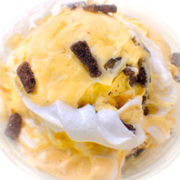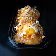 Three scoops of creamy, Vanilla Custard, Apple chunks with a touch of Cinnamon, drizzled with a sweet, rich Caramel topping and sprinkled with crushed, roasted Mixed Nuts.